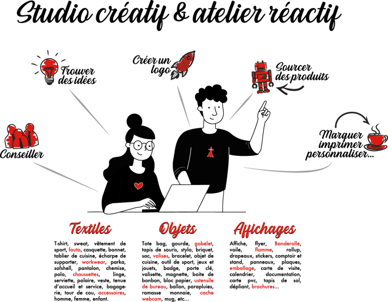 T-shirt, sweat, vêtement de sport, fouta, casquette, bonnet, tablier de cuisine, écharpe de supporter, workwear, parka, sofshell, pantalon, chemise, polo, chaussettes, linge, serviette, polaire, veste, tenue d’accueil et service, bagagerie, tour de cou, accessoires, homme, femme, enfant, Tote bag, gourde, gobelet, tapis de souris, stylo, briquet, sac, valises, bracelet, objet de cuisine, outil de sport, jeux et jouets, badge, porte clé, valisette, magnette, boite de bonbon, bloc papier, ustensile de bureau, ballon, parapluies, ramasse monnaie, cache webcam, mug, etc... Affiche, flyer, Banderolle, voile, flamme, rollup, drapeaux, stickers, comptoir et stand, panneaux, plaques, emballage, carte de visite, calendrier, documentation, carte pvc, tapis de sol, dépliant, brochures...